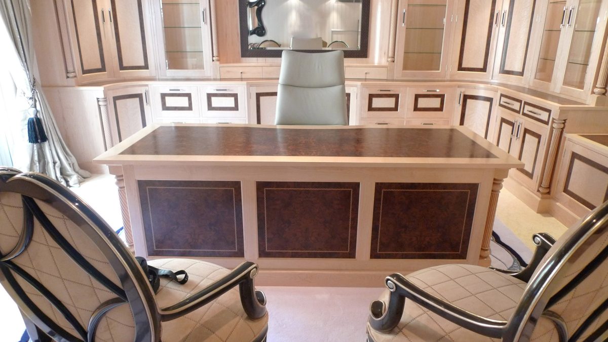 Designed specifically with the client and all details selected such as the curved drawers and display units, turnings on the fitted furniture and matching desk all the way through to the unique handles, solid maple plinth and cornice.