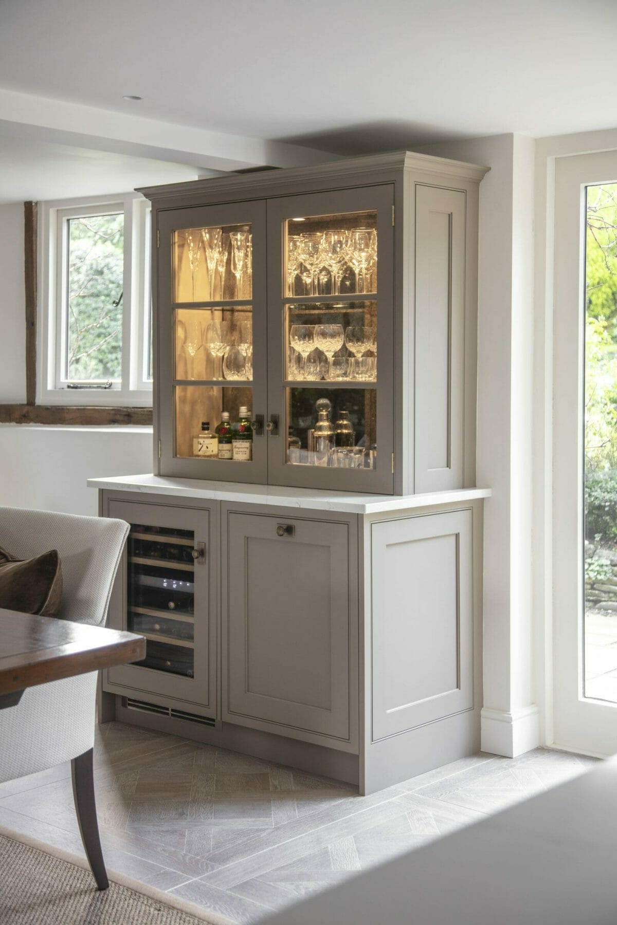 The stunning colour palette was inspired by natural materials, incorporating muted oatmeal and stone colours alongside burnished brass detailing. Stained oak veneer interiors enhance the bi-folding storage, bespoke larder and glazed dresser areas to give storage which is both practical and beautiful.
