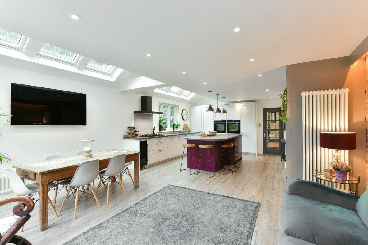 The island was colour matched to a bespoke vibrant plum colour, which was echoed in the client’s artwork and complemented by other furniture in the room. The kitchen includes Neff appliances, a black Elica extractor and a black sink & tap; a laminate worktop and lacquered.