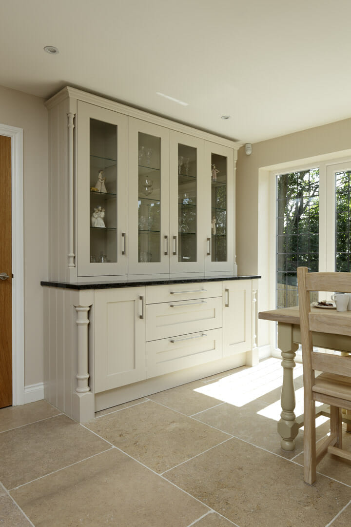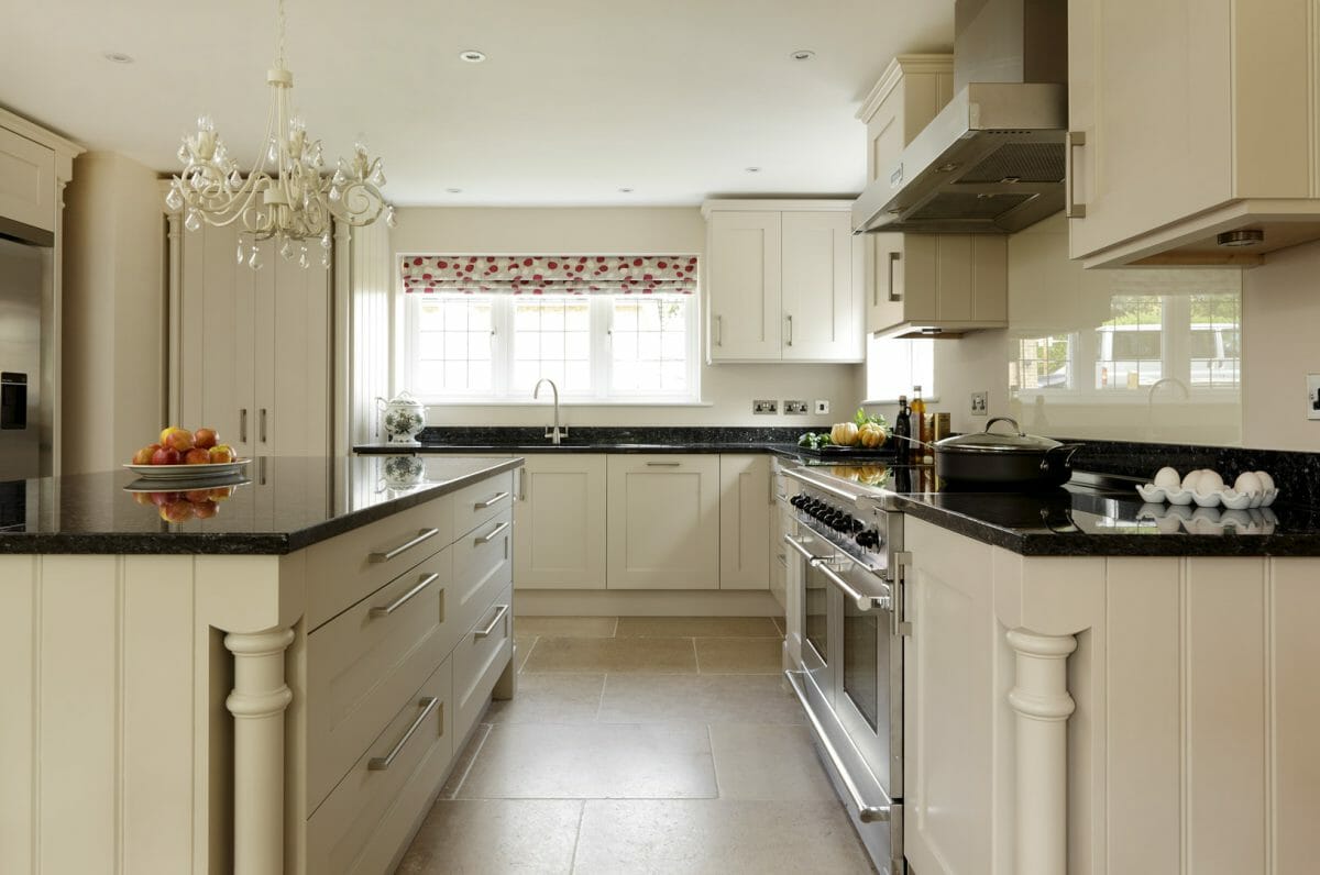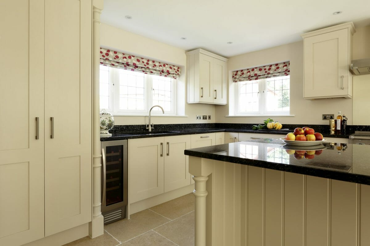 This hand painted bespoke kitchen with surface-hung doors combines the traditional with modern sitting comfortably in the new build. Tongue and groove end panels with cornice and turning in solid wood taking a simple shaker style concept and giving it a bit of luxury. Black granite worktops finish off the contemporary feel to this traditional kitchen.