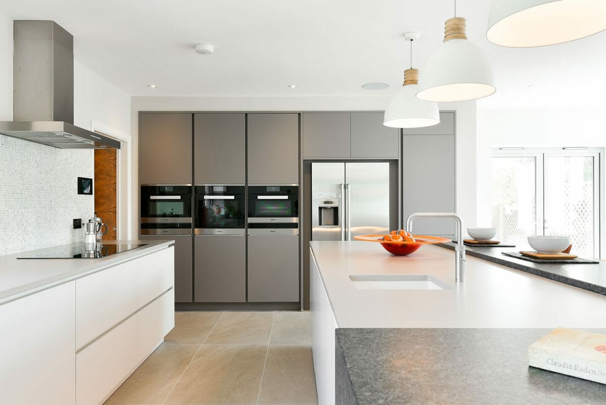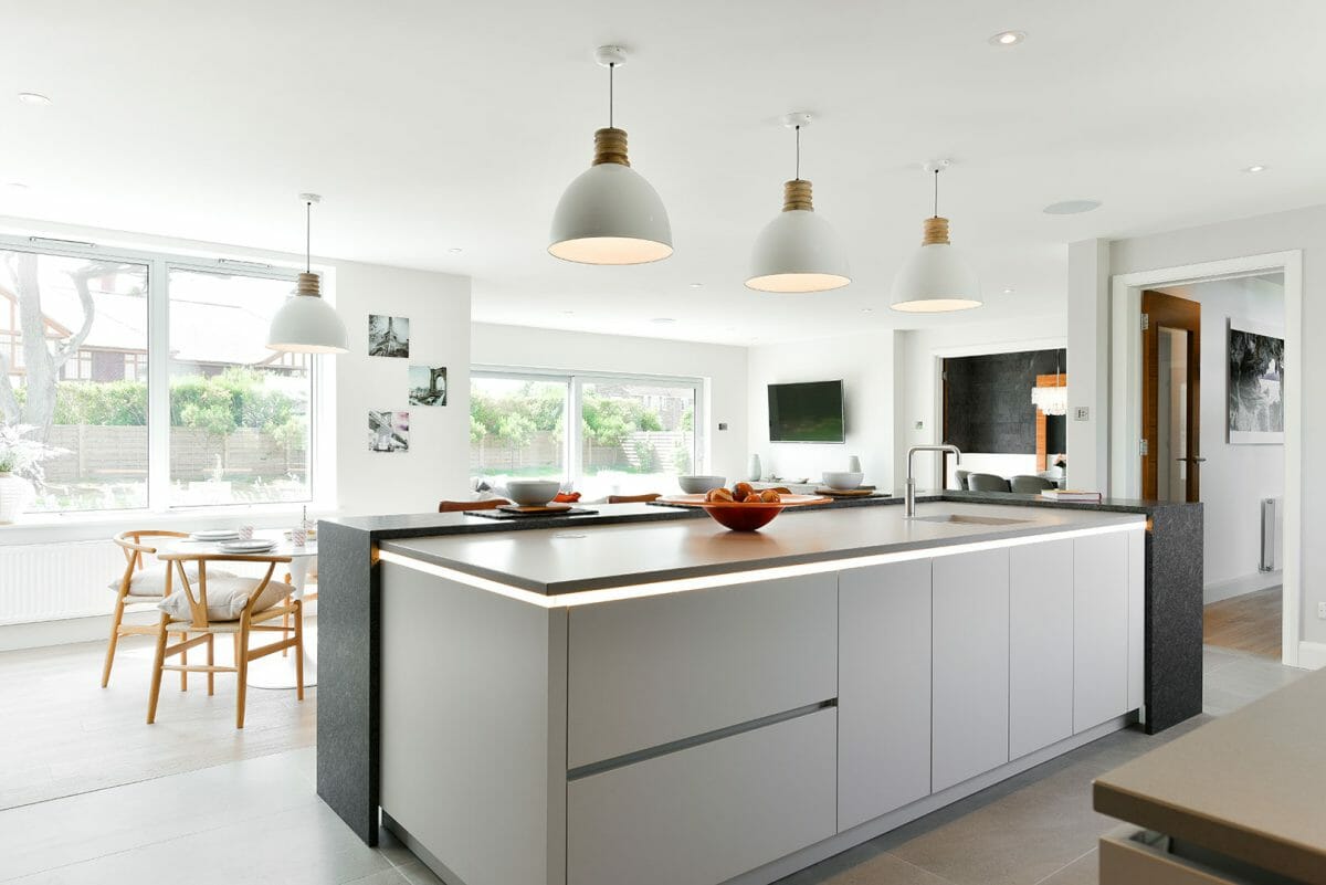 The design pivots around a central island. To create the necessary seating we added a dramatic L-shape breakfast bar with downturns at both ends, which encase and bookend the cabinetry. This is balanced by a bank of integrated tall units built recessed into the wall at the back of the room, in a line of sleek simplicity.