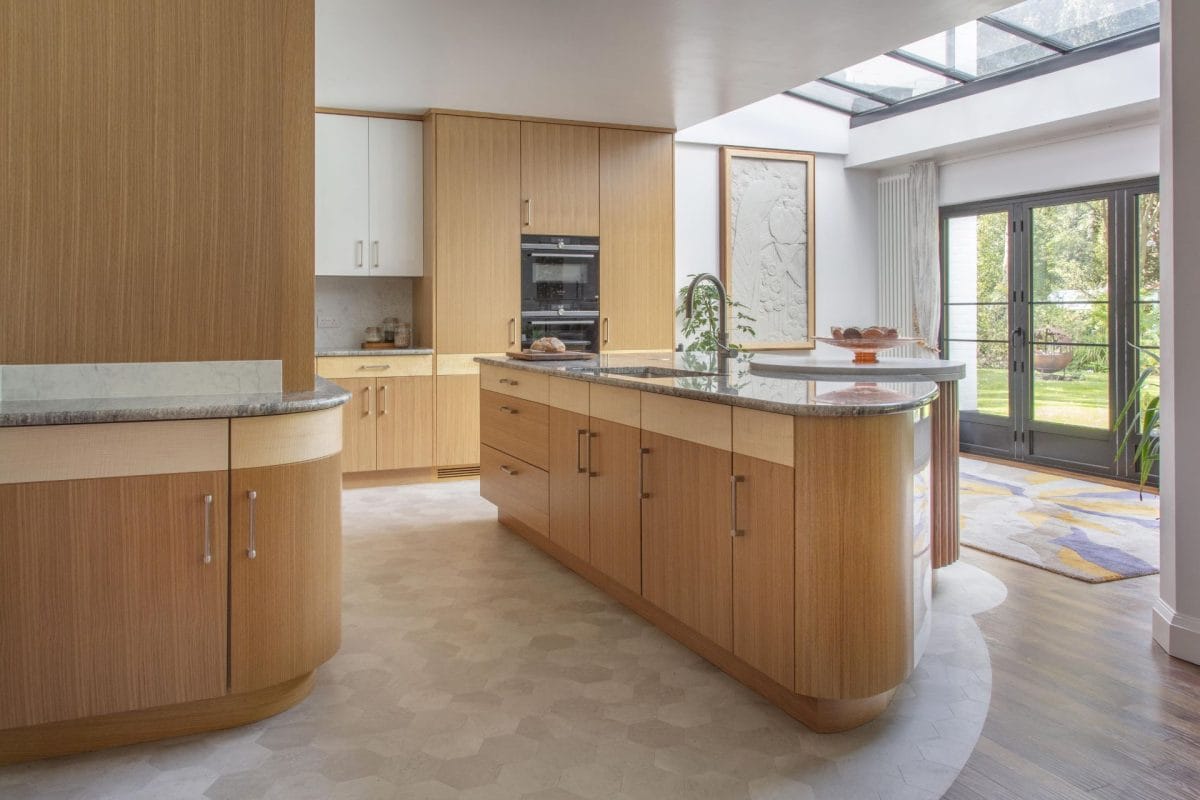 Classy curves, drawer line units with contrasting veneers, and 1920s styling are key to the look. A completely bespoke island with a sweeping a-symmetric curve is built to suit the shape of the room with its central pillar and to maximise storage within. Other clever storage solutions include: a notched larder containing pullouts and internal shelves to concealing a hidden step in the wall, hidden spice racks within the canopy, and the island’s feature ribbed-walnut round unit to house the couple’s cocktail and wine glasses adjacent to the dining area.