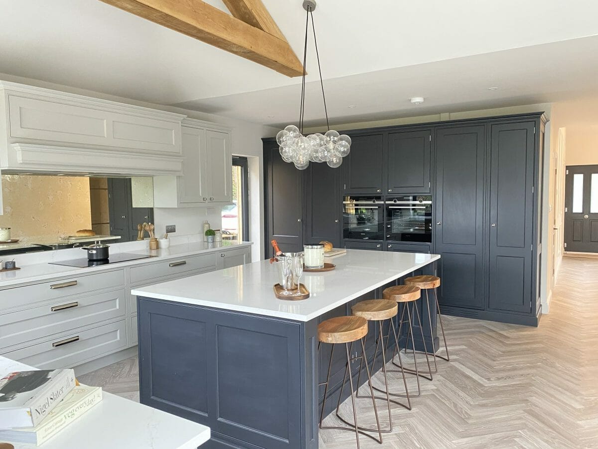 Classic cabinetry and colour palettes epitomise this timeless design. By pairing neutral colours with deep navy, light marble quartz worktops and elegant in-frame shaker units we have created a design which will stand the test of time. The open-plan space is completed with a L-shape layout, tall bank of appliance and storage towers, and a large format island beneath the stunning vaulted ceiling. Herringbone flooring, a large glass cluster pendant and elongated chrome cup handles add the perfect finishing details