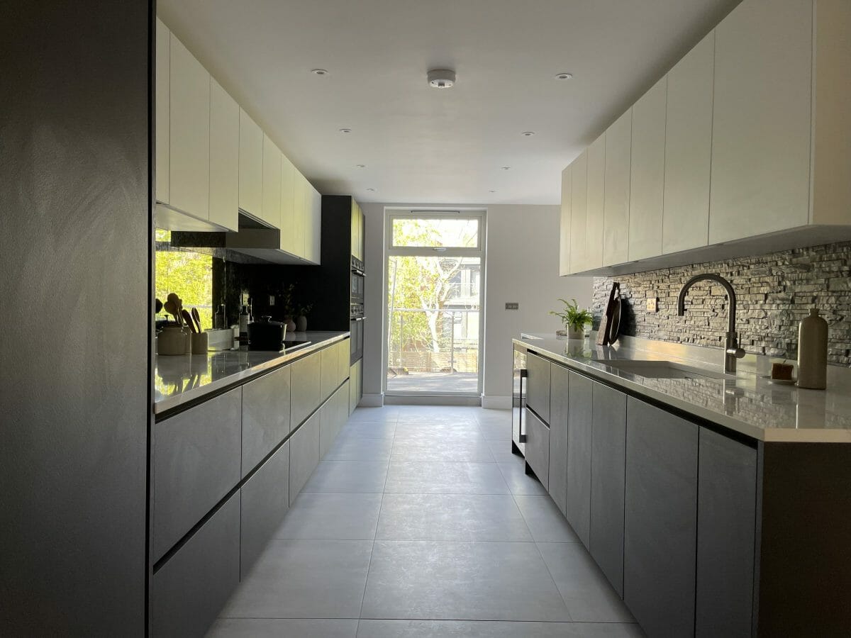 This smart galley kitchen required careful planning to balance functionality with a clean crisp look, as it opens out into the living room at either end. Designed off plan with the developers, it was also key to ensure the finishes were neutral with universal appeal without being uninspiring.